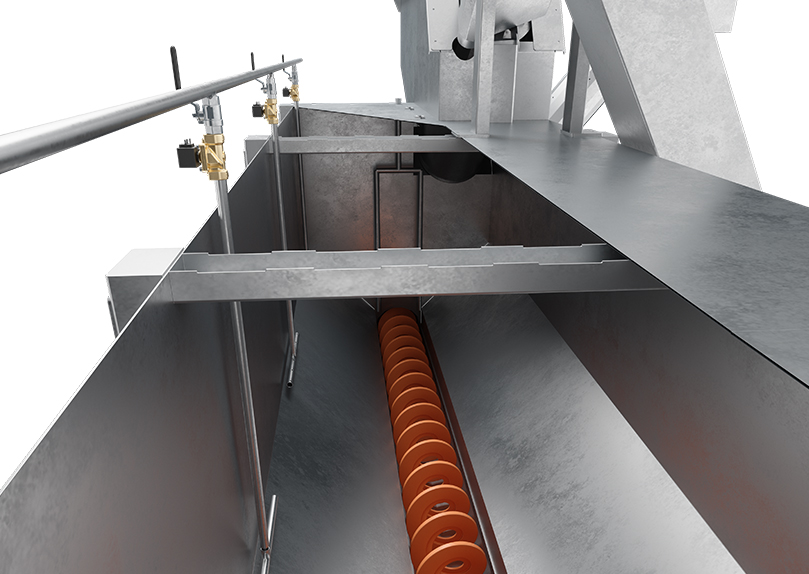 - Kraftigt trappstegsgaller (XS) med patenterat bottensteg och efterföljande tvättpress.
