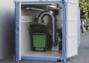 Invändigt är containern utrustad med mottagningslåda, rensgaller (alternativt renssil), tvättpress med styrning och sopkärl, samt all annan nödvändig utrustning som behövs för att driva processen på ett smidigt sätt.