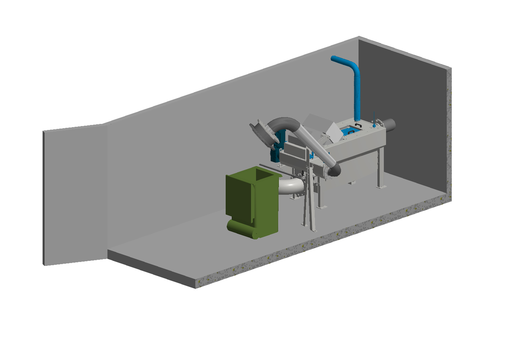 Rörsystemets utlopp är försett med Longofill och ett Longopac för en god arbetsmiljö och säker hygien. De invändiga vägg- och takytorna är behandlade med epoxy-beläggning för att enkelt kunna rengöras.